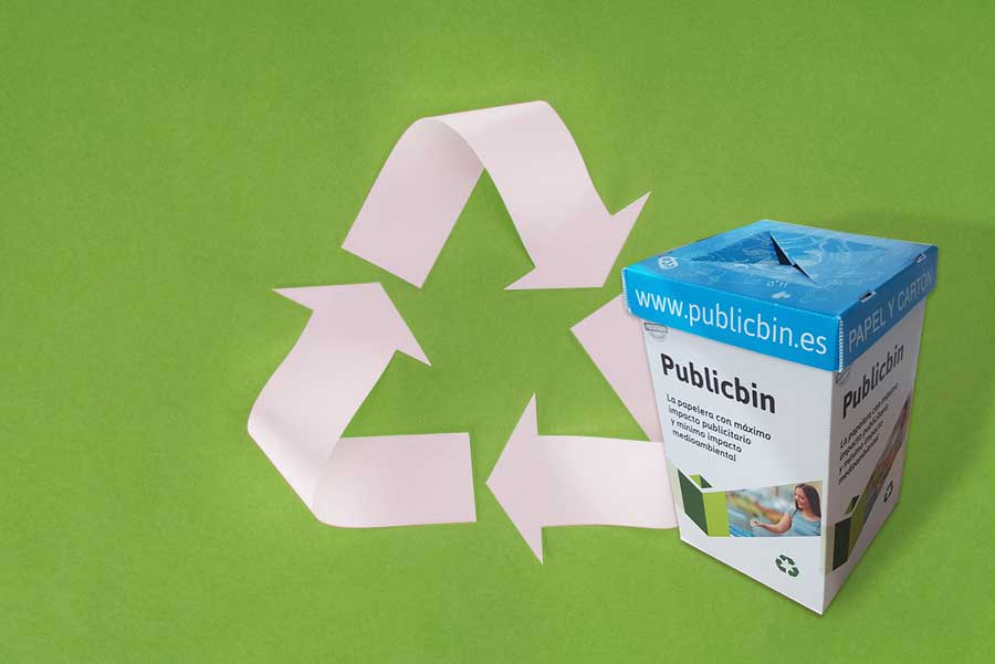 El reciclaje de cartón y el papel aporta grandes beneficios para el medio ambiente, por encima de los plásticos, la madera y el metal. Publicbin está fabricada con cartón 100% reciclado. Por cada tonelada de cartón que se recicla se ahorran 140 litros de petróleo, cincuenta mil litros de agua y 900 kilos de dióxido de carbono (CO2), el principal causante del cambio climático, frente a lo que requiere fabricar una tonelada de cartón nuevo. Por otro lado, Publicbin colabora en el reciclaje de otros materiales. Asimismo, las tintas utilizadas son respetuosas con el medio ambiente.Publicbin satisface la necesidad tanto de las instituciones y. empresas que realizan el evento como de las marcas que asumen la inversión en este soporte a cambio de un gran impacto.