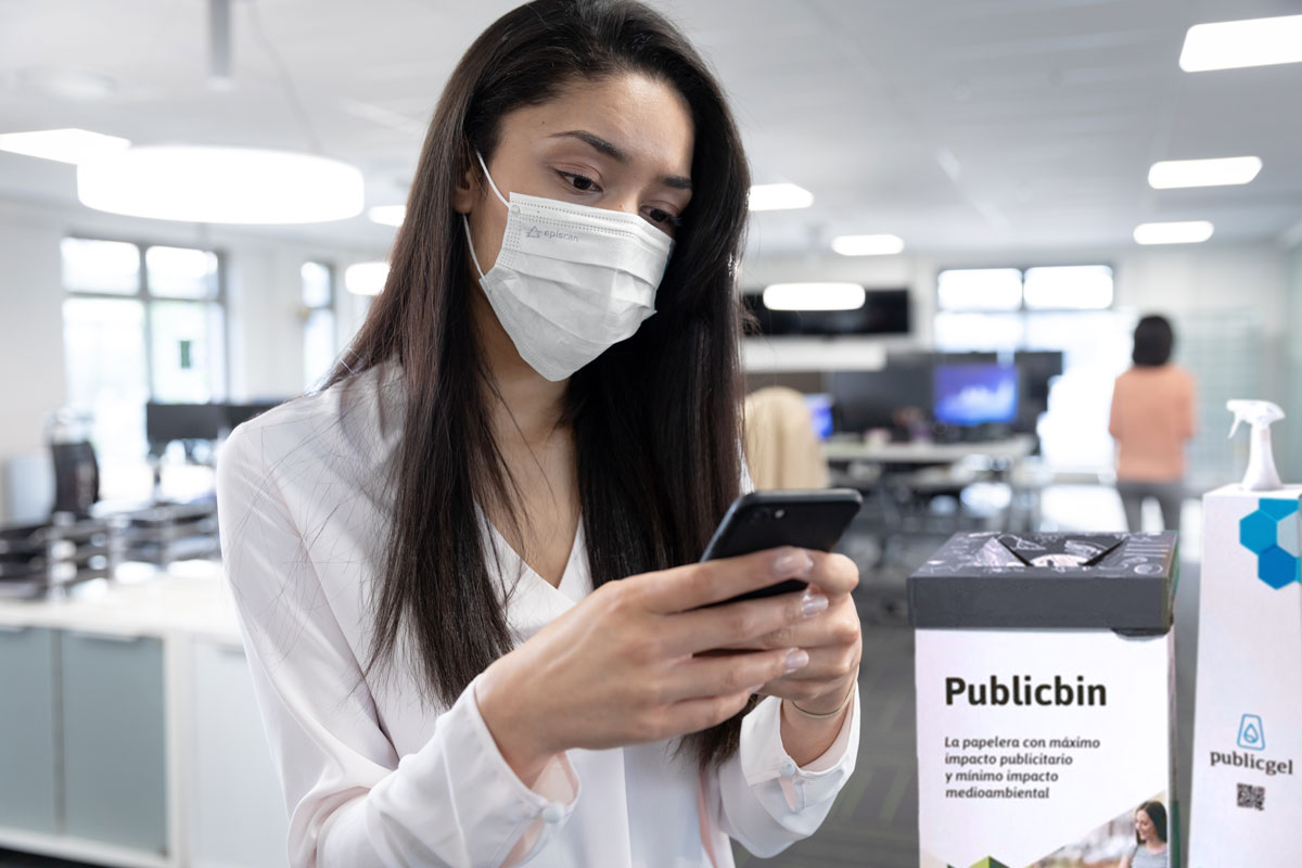 - Recuerde a los asistentes las mejores prácticas de higiene a través de soportes como publicbin y publicgel. En ellos puede incorporar las pautas de seguridad sanitaria junto con su imagen corporativa o cualquier mensaje que quiera transmitir.